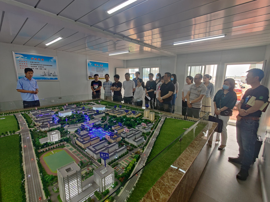活動前,建設(shè)公司一行在中建七局湖北工程職院新校區(qū)項目黨支部書記李曉龍的帶領(lǐng)下觀摩了項目沙盤室,詳細了解了湖北工程職院新校區(qū)項目進展情況。
