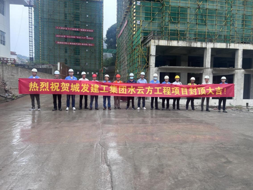 2024年7月13日,在城發(fā)·水云方項目現(xiàn)場舉行(北區(qū))主體結構封頂儀式。城發(fā)建工集團黨總支副書記、總經(jīng)理馮志華,城發(fā)建工集團黨總支委員、副總經(jīng)理洪登峰出席活動。項目施工單位、監(jiān)理單位等參建各方代表20余人參加項目(北區(qū))主體結構封頂儀式。